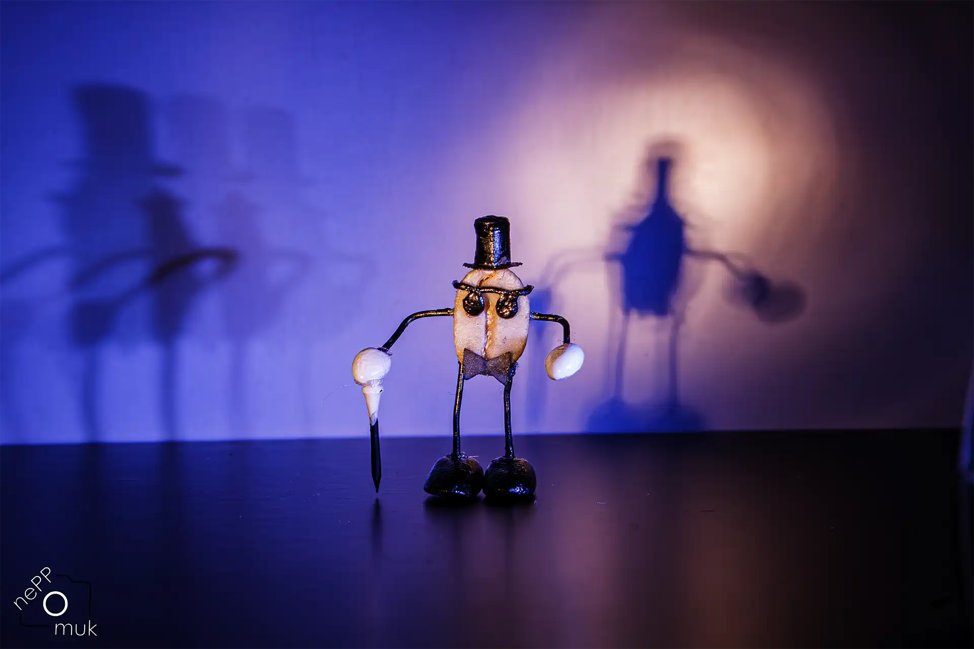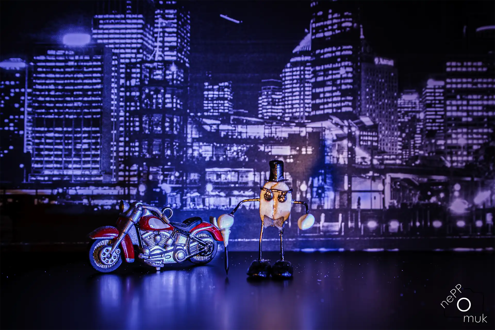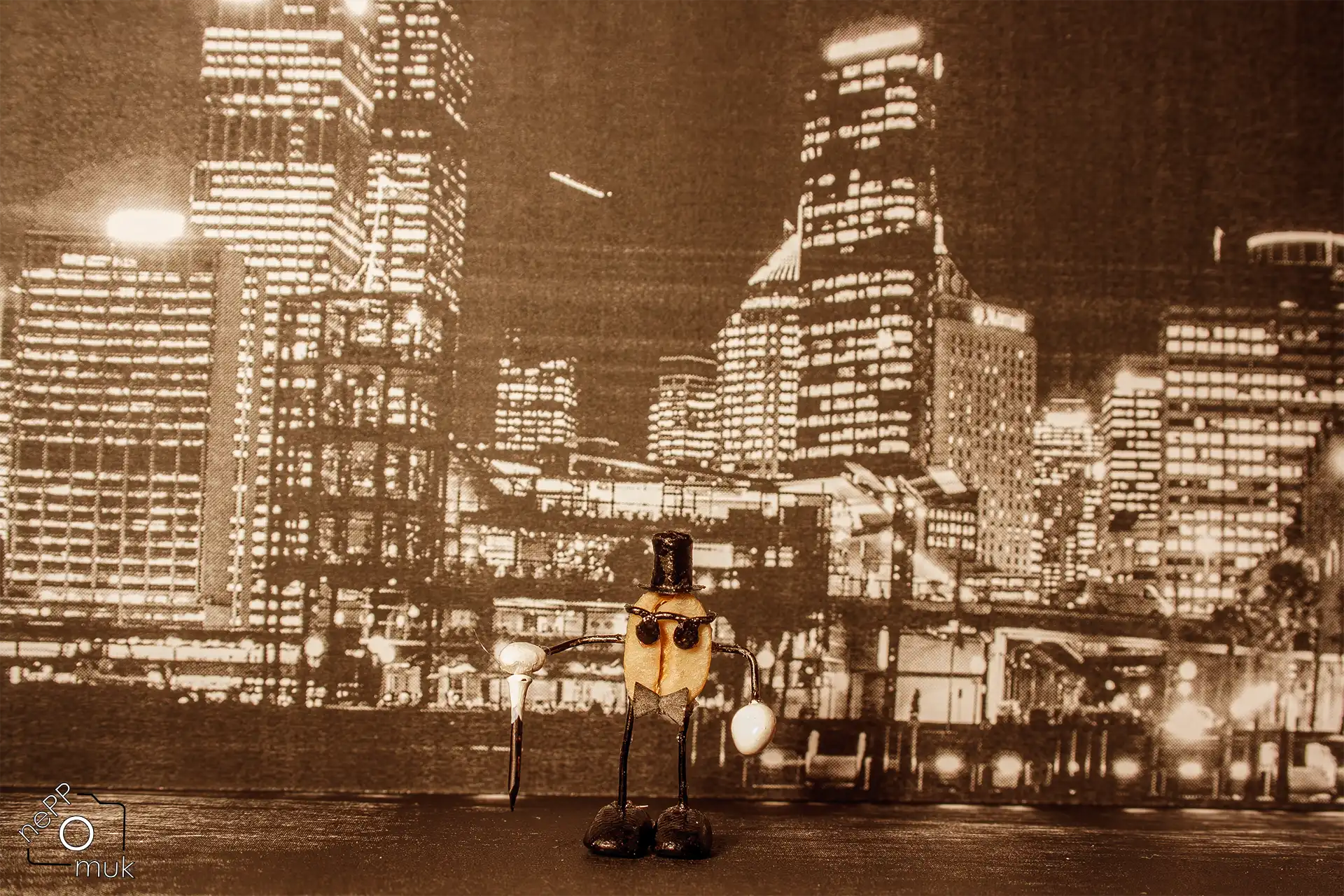 Mit Zylinder, dunkler Brille und Stock steht er im Scheinwerferlicht wie ein Crooner der alten Schule. Die Bühne gehört ihm. Hinter ihm glitzert die nächtliche Skyline, Neonlicht zeichnet harte Konturen, Schatten fallen dramatisch auf den Hintergrund. Alles wirkt wie eine Miniaturausgabe von Las Vegas – irgendwo zwischen Revue, Jazzclub und Silvester-Show.