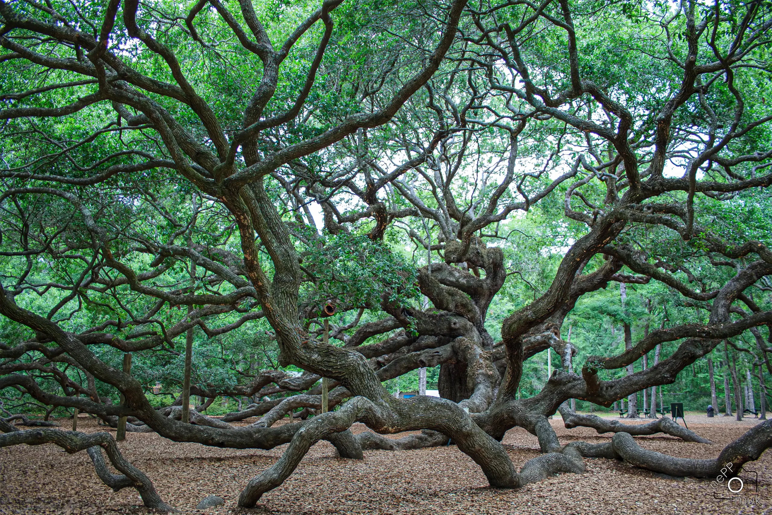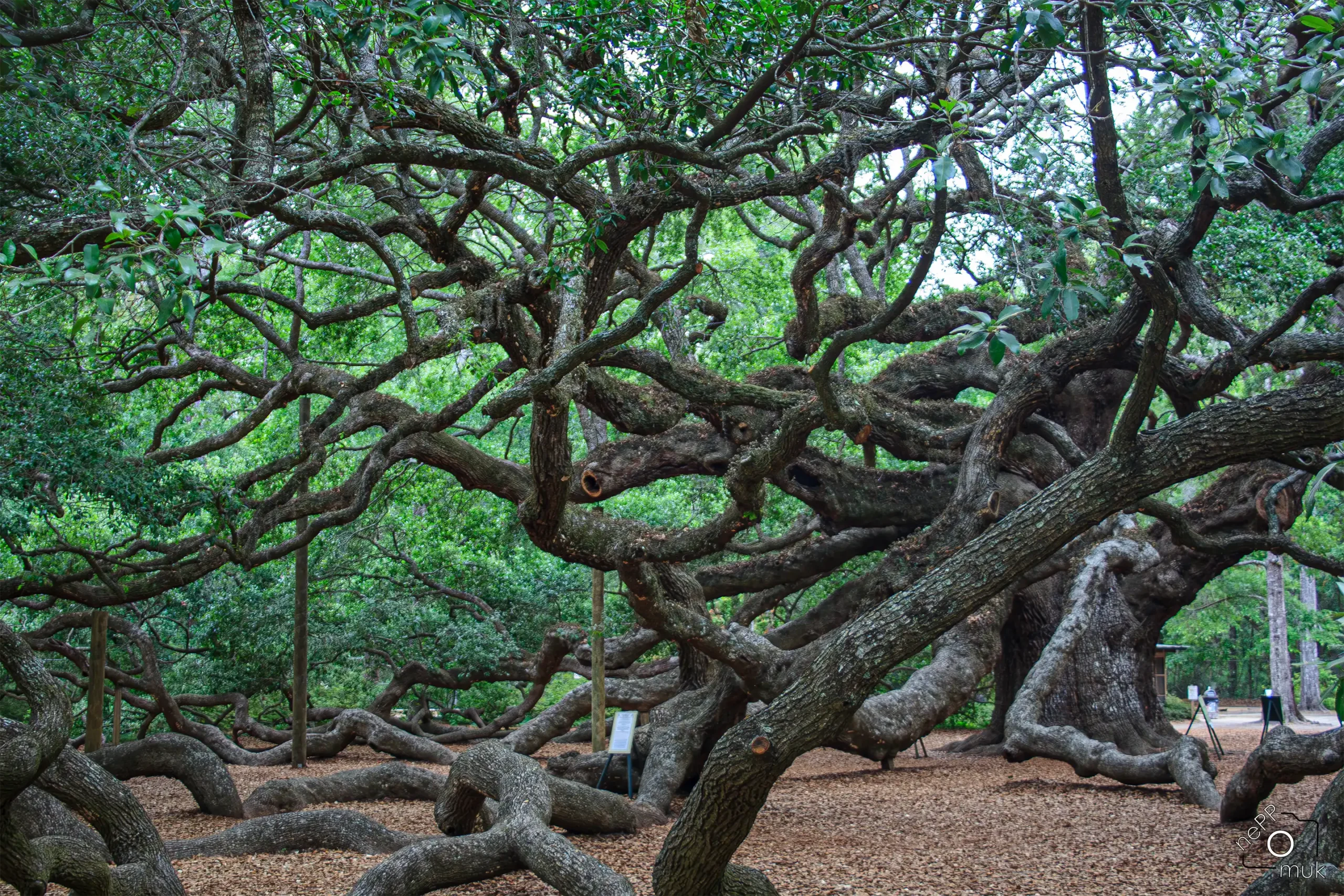 Der Angel Oak Tree ist kein einzelner Stamm mit Krone, sondern ein komplexes System aus tragenden und getragenen Strukturen. Viele der ausladenden Äste senken sich im Laufe der Jahrhunderte bis zum Boden ab, wo sie erneut Wurzeln schlagen und den Baum zusätzlich stabilisieren. Dieses Zusammenspiel aus Wachstum und Selbstabstützung erklärt, warum der Angel Oak trotz seines Alters und der enormen Ausdehnung noch immer vital wirkt.